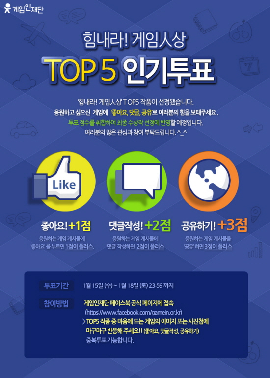 TOP5 온라인 투표는 게임인재단 공식 페이스북 페이지(https://www.facebook.com/gamein.or.kr) 에서 진행 예정이며, ▲ 좋아요 ▲ 댓글 작성 ▲ 공유하기 등 총 3가지 방법으로 참여 가능하다. 기간은 금일 15일(수) 오후부터 18일(금) 23시 59분까지 이다.