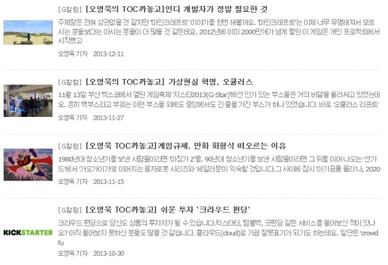 격주마다 목요일에 연재된 ‘오영욱 TOC까놓고’는 “남이 안 다룬 것, 말하고 싶은 것을 다루고 싶었다. 가령 색맹-색약이 있는 장애인 유저, 남녀평등, 열악한 개발 환경, 게임규제-만화 화형식 떠오르는 이유, 지스타 보이콧 제안하는 이유 등이 산업논리가 놓친 것을 이슈화하고 싶었다”.