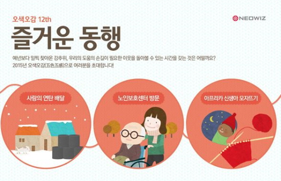 네오위즈 마법나무재단 측은 “연말을 의미 있게 보내고자 송년회를 대신해 시작된 ‘오색오감’은 이제 연말이 되면 기다리는 직원들이 생겼을 정도로 구성원들에게 공감대를 이끌어내는 따뜻한 행사로 자리잡았다”고 말했다.