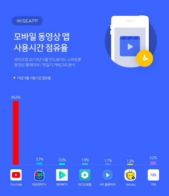 앱분석 업체 와이즈앱은 지난 5월 한 달 한국 모바일 동영상 플레이어 및 편집기 앱의 사용시간과 점유율을 발표했다.