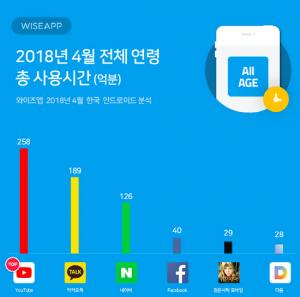 와이즈앱이 조사한 시간과 점유율 1위는 ‘유튜브(YouTube)’로 3043만 명이 총 291억 분을 이용했다. 구글플레이의 ‘동영상 플레이어 및 편집기’로 등록된 모든 앱들의 총 사용시간인 341억 분 중 85.6%다.