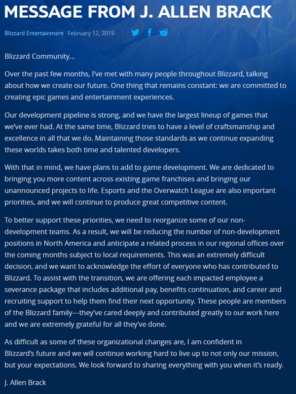 이어 앨런 브랙 대표는 “이것은 매우 어려운 결정이었으며, 블리자드에 공헌한 모든 사람들의 노력을 인정해줄 것”이라며 “퇴직하는 직원에게는 추가 급여와 복리 후생이 포함된 퇴직 패키지 프로그램을 제공한다”고 전했다. 또한 “이들은 블리자드 가족의 일원이었고, 우리는 그들에게 깊이 감사한다”고 덧붙였다.