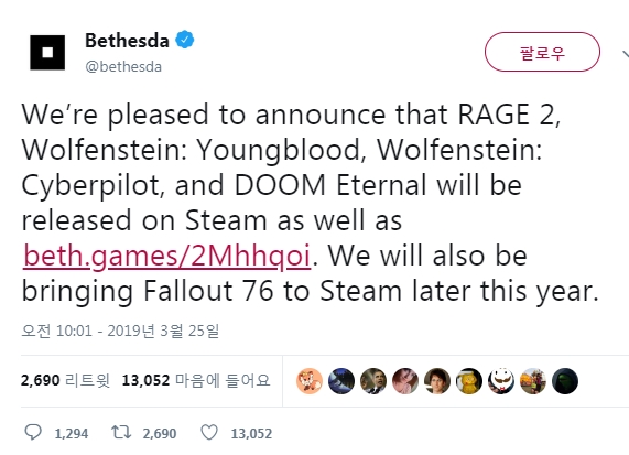 베데스다는 25일(현지시각) 공식 트위터를 통해 “레이지2(RAGE 2), 울펜슈타인: 사이버파일럿, 둠 이터널을 스팀에도 출시할 것”이라며 “폴아웃76 또한 올해 안에 스팀에 내놓겠다”고 밝혔다. 베데스다의 자체 스토어인 베데스다 스토어(베데스다넷)는 계속해서 별도 운영된다.