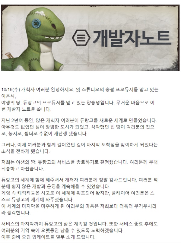 두 사람은 “여러분과 함께 걸어왔던 길이 마지막 도착점을 맞이하게 되었다는 소식을 전하게 되어 무척 죄송하고 아쉽다”며 “서비스의 마지막까지 듀랑고의 삶은 계속될 것이며 서비스 종료 후에도 여러분의 기억 속에 오랫동안 남을 수 있도록 노력하겠다”고 밝혔다.