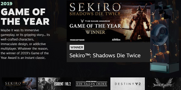 프롬 소프트웨어의 ‘세키로: 섀도우 다이 트와이스’가 스팀(steam) 유저들이 뽑은 최고의 게임으로 선정됐다.