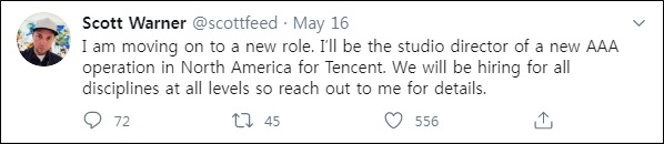 스캇 워너는 ‘폴아웃2’, ‘발더스게이트’, 헤일로4’, 배틀필드’ 등 여러 게임에서 20여년간 QA 테스터 및 개발자로 근무했다. 그는 16일(현지시각) 트위터를 통해 “새로운 역할을 맡았다”며 “텐센트 북미 지사의 AAA 프로젝트 디렉터를 맡게 됐다”고 밝혔다. 그가 근무하게 될 티미 스튜디오는 텐센트의 간판 모바일게임 ‘왕자영요’와 ‘콜오브듀티 모바일’을 만든 곳이다. 티미 스튜디오는 최근 13개 분야의 채용 공고를 통해 AAA급 게임 경력 개발자들을 모집하기 시작했다.
