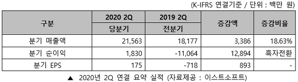 이스트소프트(대표 정상원)는 K-IFRS 연결재무제표 기준 2020년 2분기 매출액 215.6억 원, 분기 순이익 18.3억 원으로 집계됐다고 13일 공시했다.