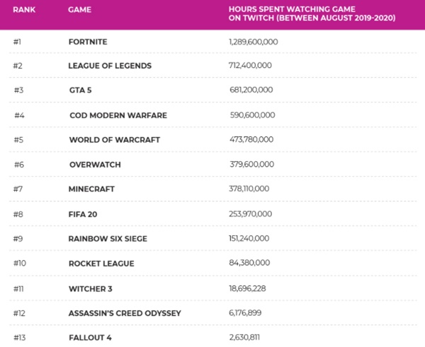 영국 게임 유통업체 게임(GAME)은 11일(현지시각) 전 세계 콘솔/PC 게임들을 대상으로 총 플레이 시간 및 트위치 시청 시간을 조사한 게임 보고서를 발표했다. 이번 조사에는 트위치 통계 사이트 트위치트래커(TwitchTracker), 소니 콘솔 통계 사이트 겜스탯(Gamstat), 액티비전의 공식 발표 등이 자료로 활용됐다.