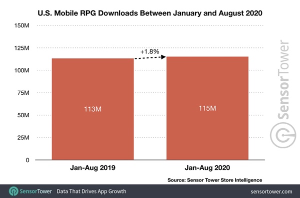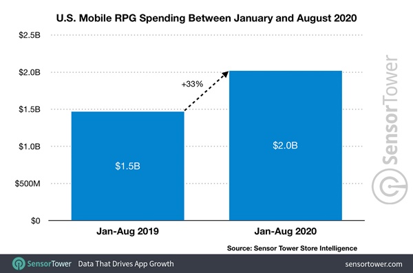 시장조사업체 센서타워가 23일(현지시각) 발표한 보고서에 따르면 2020년 1월부터 8월까지 미국 모바일게임에서 RPG 장르의 매출이 전년 대비 33% 증가한 20억달러(약 2조3400억원)로 나타났다. 상위 100개 게임 매출을 살펴봤을 때, RPG 장르는 전년 대비 27.6%의 성장률을 보이며 슈팅, 아케이드에 이어 성장률 7위를 기록했다.