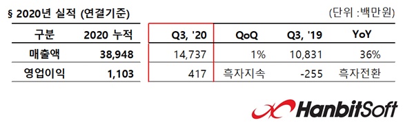 한빛소프트는 올해 3분기 연결 재무제표 기준 매출 147억원, 영업이익 4억원을 기록했다고 11월13일 공시했다.