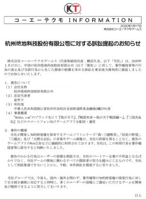 코에이 테크모는 “허락 없이 저작물을 복제(일부 수정 포함), 배포하는 것은 저작권자의 권리를 침해하는 행위이며 불법”이라며 “앞으로도 저작권 침해 행위에 대해 엄격하게 대응하는 동시에, 이용자들이 만족할 게임을 제공할 수 있도록 노력하겠다”고 덧붙였다.