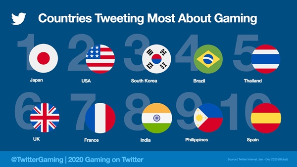 게임과 관련해서 가장 많이 트윗을 하는 국가는 일본이었다. 그 뒤로 미국(2위), 한국(3위), 브라질(4위), 태국(5위), 영국(6위), 프랑스(7위), 인도(8위), 필리핀(9위), 스페인(10위) 순이었다. 여기에는 트위터를 서비스하지 않는 중국은 제외됐다.