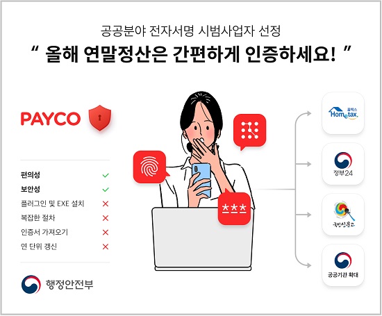 NHN페이코(대표 정연훈)는 국세청 홈텍스에 이어 정부 대표 포털인 정부24의 ‘연말정산용 주민등록등본 발급 서비스’에 ‘페이코(PAYCO) 인증서’를 전자서명 수단으로 적용 완료했다고 13일 밝혔다.