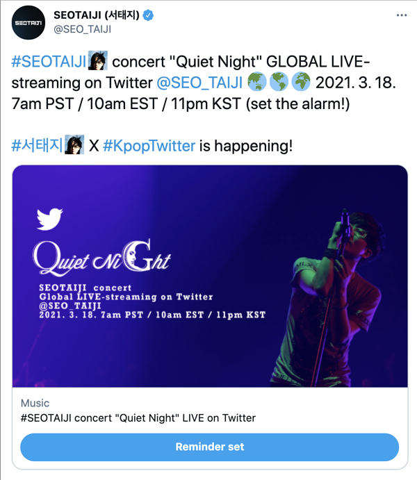 뮤지션 서태지의 ‘콰이어트 나이트’ 콘서트 영상을 트위터에서 즐길 수 있다. 서태지의 트위터 글로벌 라이브스트리밍은 이번이 처음으로, 전 세계 팬들이 트위터를 통해 집에서 서태지의 공연을 감상할 수 있게 됐다.