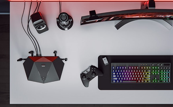 제품의 외형적 특징은 검은색과 빨간색, 줄여서 검빨이라 부르는 색상의 조화다. 검은색을 베이스로 한 기기에 빨간색으로 포인트를 줬다. 메쉬 형태의 철제 구조로 기기 발열관리와 멋스러움을 동시에 잡았다. LED 조명으로 멋스러움을 극대화하는 게이밍 기기 시장의 흐름을 반영한 디자인이다.
