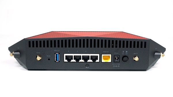 제품 뒤쪽은 유선 연결을 위한 포트들이 줄지어 있다. 왼쪽부터 USB 3.0, 이더넷 포트 4개, 인터넷(WAN) 포트, 어댑터 연결부와 전원 버튼 순이다. 랜선 포트는 모두 기가비트 규격이며, 최대 1Gbps 통신을 보장한다.