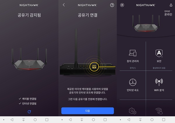 설치와 간단한 설정은 모바일 애플리케이션(앱) 나이트호크를 쓰면 된다. 이 앱은 기본적인 네트워크 구성과 상태를 모니터링할 수 있는 기능을 제공한다. 특히 초기 설치를 사진과 함께 단계별로 알려줘, 공유기 설치가 어려운 유저라면 앱을 사용하는 편이 더 간단하다. 자세한 설정 방법은 제품 박스에 동봉된 가이드를 참고하면 된다.