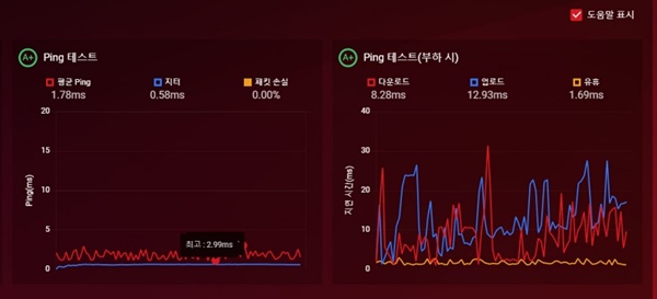 공유기 초기 설정을 마친 기본 상태에서 kt 기가 인터넷(500Mbps) 회선을 테스트했을 때 다운로드 속도는 평균 420Mbps를 유지했다. 핑은 대기 상태일 때 2ms였으며, 다운로드와 업로드 부하 상태일 때 핑은 평균 10ms~13ms로 측정됐다. 이는 다양한 스트리밍 영상을 재생하고 업로드하는 환경에서도 쾌적한 게임이 가능하다는 점을 보여준다. 업로드 대역폭이 중요한 고화질 인터넷 실시간 방송과 멀티플레이 게임을 동시에 해도 렉을 걱정하지 않아도 되는 수준이다.