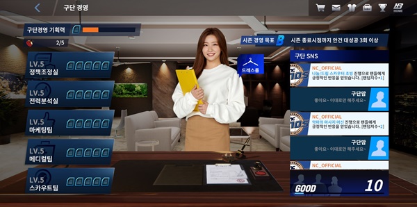 프로야구 H3의 ‘구단 경영’은 다른 매니지먼트 게임에서 찾기 어려운 콘텐츠다. 프런트의 역할이 확대된 현대 야구의 트렌드를 반영해 마련됐다. 이용자는 5개의 전문 분야(정책조정실, 전력분석실, 마케팅팀, 메디컬팀, 스카우트팀)로 이루어진 프런트에서 안건을 받아 결재, 또는 반려를 선택할 수 있다.