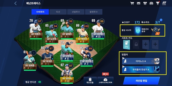 팀컬러와 시너지는 해당하는 모든 선수의 능력치를 올려주기 때문에 매우 중요한 요소다. 팀컬러는 같은 연도나 팀, 출신지 등의 선수로 라인업을 구성했을 경우 장착할 수 있는 버프고, 시너지는 라인업 선수들이 특정 조건을 만족했을 경우 자동으로 발생하는 버프다. 자신이 활용할 수 있는 팀컬러와 시너지를 계산해 라인업을 구성하는 게 전략적 요소로 꼽힌다.