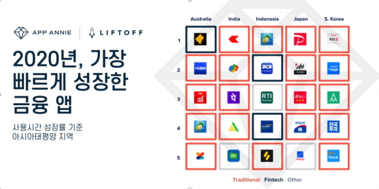 해당 보고서는 “유럽 및 북미에서는 여전히 전통 뱅킹 앱이 인기가 있는 반면, 아시아 태평양 전 지역에서 핀테크 앱의 사용 시간이 증가하고 있는 것을 발견할 수 있었다”고 전했다.