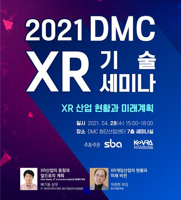서울산업진흥원(대표 장영승, 이하 SBA)와 한국가상증강현실산업협회(협회장 신수정, 이하 협회)가 공동으로 주최하는 ‘2021 DMC XR 기술 세미나’가 오는 28일(수) 오후 3시에 서울 상암동 DMC 첨단산업센터에서 열린다.