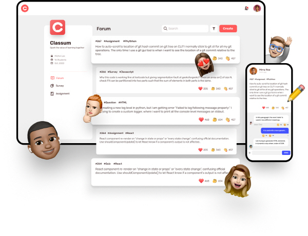클라썸은 학습자가 자발적으로 서로 질문하고 토론하는 환경을 제공한다. 화상 및 영상 강의, 공지, 설문, 1:1 피드백, 익명 질의응답 등 최적화된 기능으로 온택트 시대 교육 현장의 어려움을 해결하고 있다.