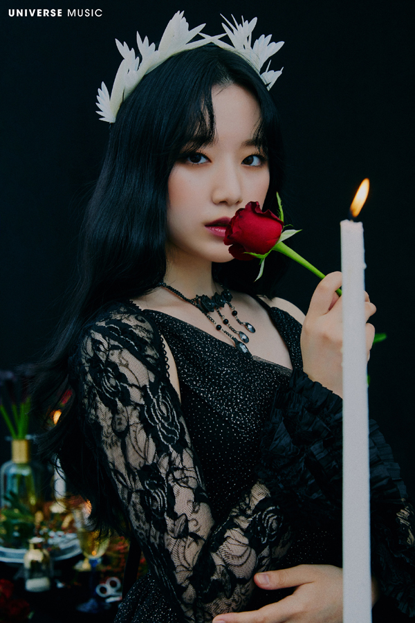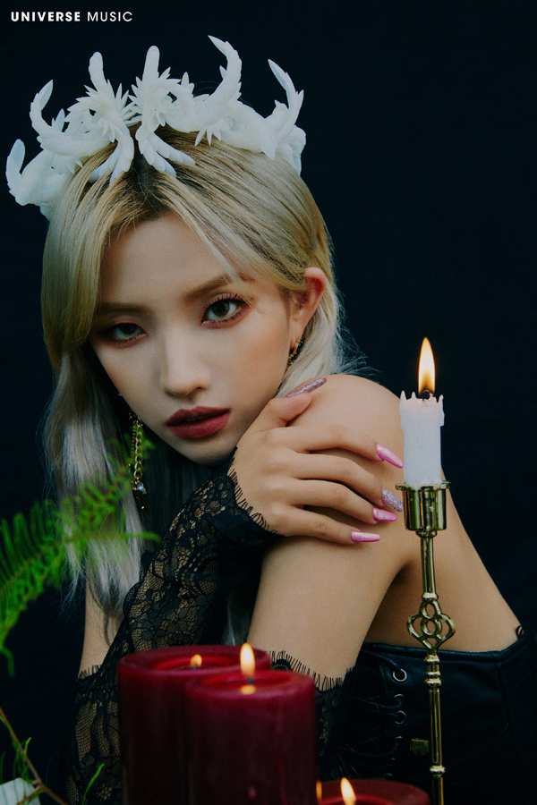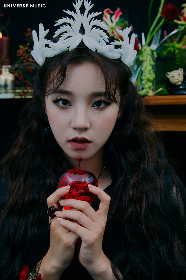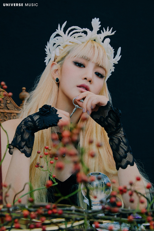 공개된 사진 속에는 유니크한 모양의 왕관을 쓴 채 신비로우면서도 몽환적인 매력을 발산하는 (여자)아이들의 모습이 담겼다. 미연, 민니, 소연, 우기, 슈화는 붉은색 열매, 장미꽃 등으로 저마다 포인트를 갖추며 다채로운 매력을 드러냈다.