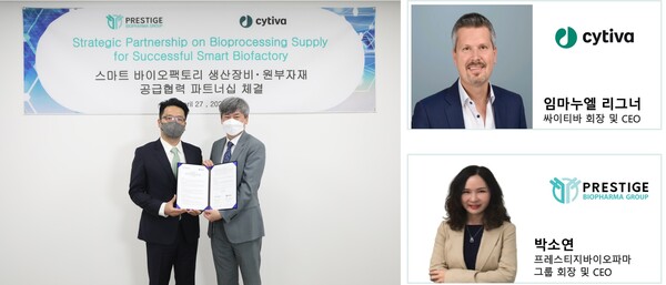 싸이티바(Cytiva) 코리아(대표 최준호)와 프레스티지바이오파마그룹(회장 박소연)은 27일 오전 9시 프레스티지바이오파마그룹의 백신 제조소가 위치한 충북 오송에서 전략적 파트너십 협약을 체결했다.