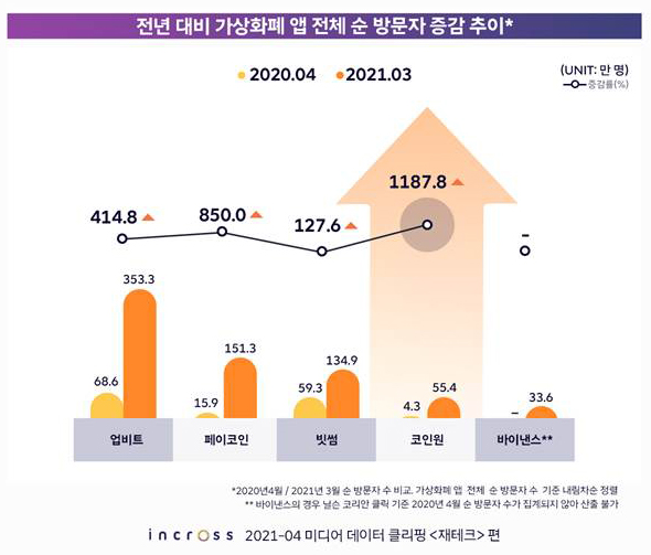 2021년 3월 기준 가상화폐 앱 이용 추이를 분석한 결과 ‘업비트(353.3만 명)’가 순방문자 수 1위를 기록했다. 업비트의 순방문자는 전년 대비 무려 414.8% 증가했으며, 2위를 차지한 페이코인(151.3만 명)과도 큰 격차를 벌렸다. 빗썸(134.9만 명)은 순방문자 수 3위를 기록했다.
