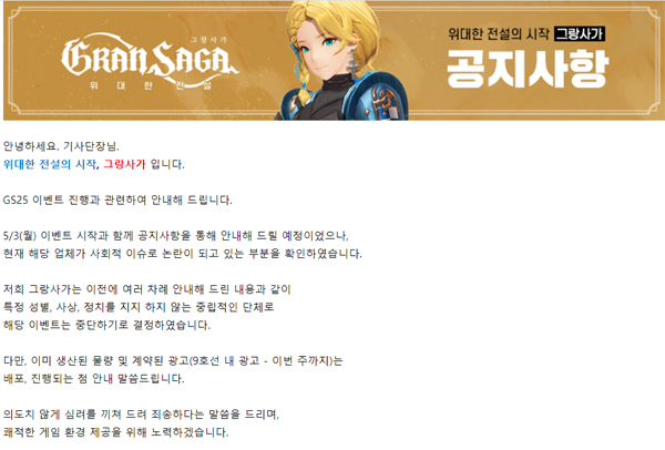 모바일 게임 ‘그랑사가’ 개발사가 남성혐오 논란이 불거진 GS25와의 제휴 이벤트를 중단하기로 했다.