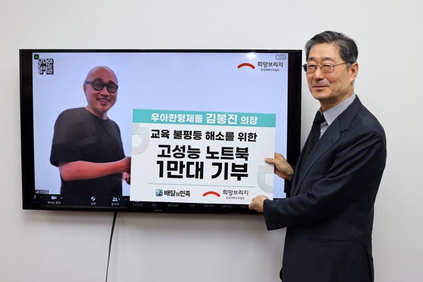 이 자리에서 김 의장은 지난 2월 발표한 ‘재산 절반 이상 사회 환원 약속’의 첫 이행 방안으로 저소득층 학생 1만명에게 고성능 노트북을 지원하기로 했다. 노트북은 이날부터 약 두 달에 걸쳐 전국 1만명 학생에게 순차적으로 지급될 예정이다.