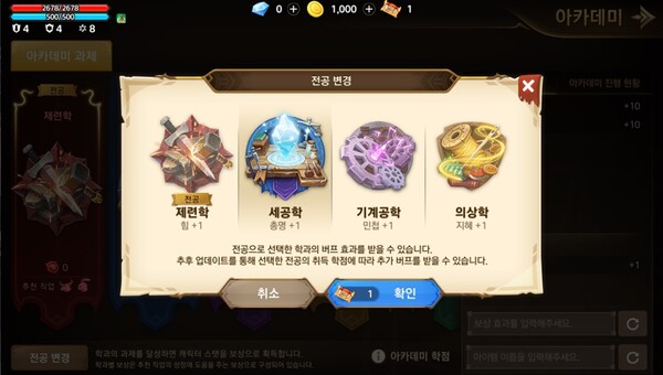 아카데미는 캐릭터의 성장을 돕기 위한 시스템이다. 이용자는 총 5개의 전공(보석학, 제련학, 세공학, 기계공학, 특별학) 과제를 달성해 캐릭터를 성장시킬 수 있다. 전공으로 선택한 학과에 따라 다른 버프 효과를 받는다.