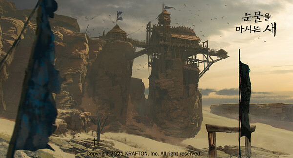 크래프톤은 이영도 작가의 '눈물을 마시는 새'와 '피를 마시는 새' IP를 활용한 게임 제작을 위해 비주얼 R&D 작업을 진행 중에 있다. 그중 오늘 공개한 삽화 2점은 ▲소설이 시작하는 남쪽의 ‘마지막 주막’과 ▲ ‘나가’족의 ‘사모 페이’를 태운 대호 ‘마루나래’이다. 비주얼 R&D의 결과물은 소설의 세계관과 분위기를 게임 및 다양한 2차 창작물로 구현할 때 쓰일 기본 콘셉트 이미지가 된다.