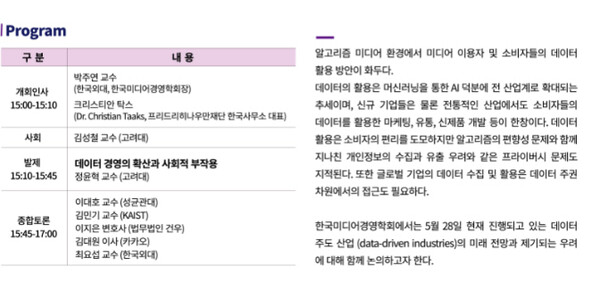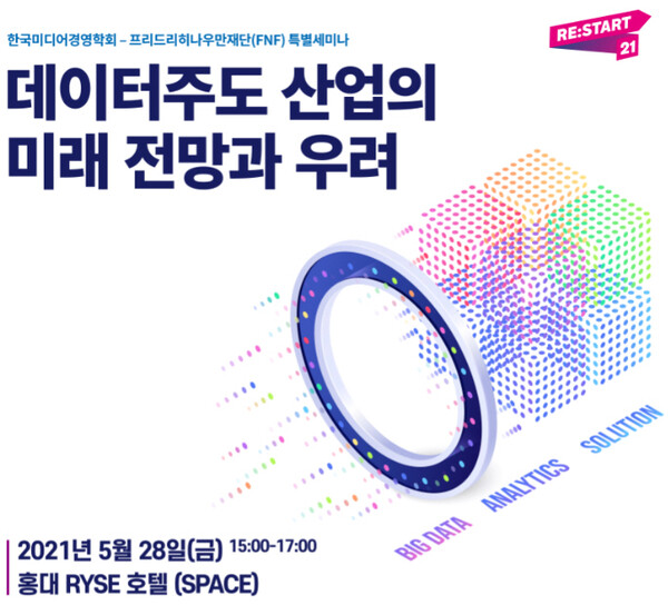 한국미디어경영학회(학회장 박주연, 한국외대 교수)는 프리드리히나우만재단(FNF)과 공동으로 오는 5월 28일(금) 오후 3시 홍대 라이즈호텔 스페이스에서 ‘데이터주도 산업의 미래 전망과 우려’를 주제로 특별세미나를 개최한다.