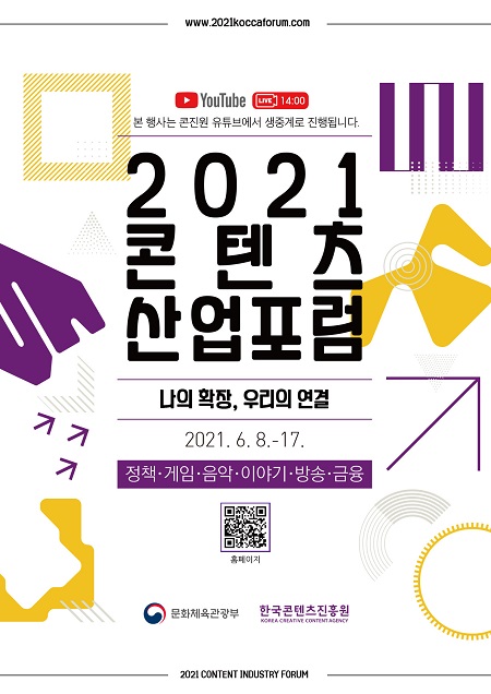 문화체육관광부(장관 황희)와 한국콘텐츠진흥원(원장직무대행 정경미)은 ‘2021 콘텐츠산업포럼’을 오는 8일부터 10일, 15일부터 17일까지 총 6일 간 개최한다.