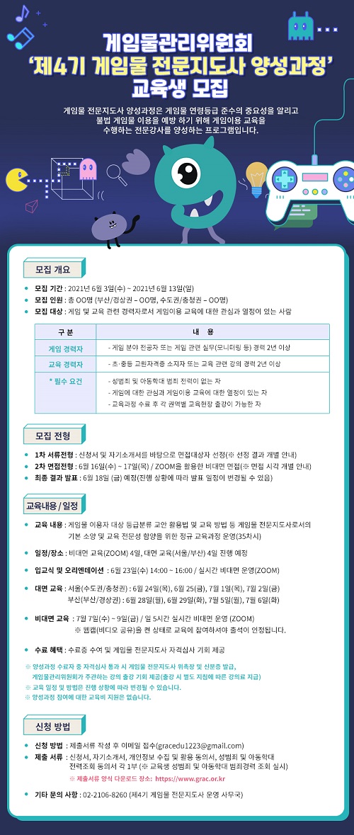 제4기 게임물 전문지도사 양성과정은 게임물 연령등급 준수의 중요성을 알리고, 불법 게임물 이용을 예방하기 위한 게임이용 교육을 수행하는 전문 강사를 양성하는 프로그램이다. 양성과정은 게임 또는 교육 관련 2년 이상 경력자로서 게임이용 교육에 대한 관심과 열정을 가진 사람을 대상으로 한다.