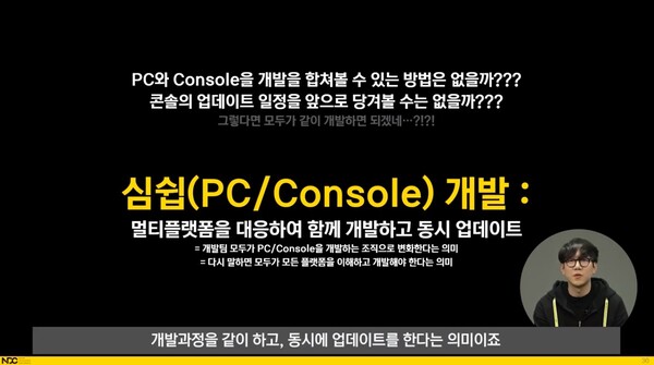 그는 “심쉽을 위해서는 가장 먼저 문화를 형성하는 게 중요하다”며 “리더가 결정하더라도 실무자가 함께 움직여주지 않으면 절대 이루어질 수 없는 개념”이라고 말했다. PC 버전 개발팀과 콘솔 버전 개발팀이 함께 열린 마음으로 개발해야 한다는 설명이다. PC 버전 개발팀은 콘솔을 염두에 두고 작업했고, 어려움이 생기면 콘솔 버전 개발팀의 지원을 받아 팀내 개발 지식을 내재화했다. 또 콘솔 버전 개발팀도 ‘기술 부채’를 해결하고 시스템화를 하려고 노력했다.