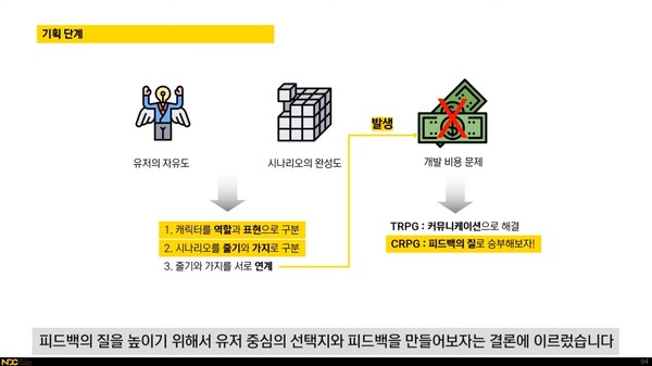 이 기획자는 “하지만 사람이 아닌 컴퓨터가 커뮤니케이션을 처리하는 CRPG에서 이같이 다양한 서브 플롯을 구현하려면 개발 비용이 많이 든다”며 “대신 피드백의 질을 높이는 방법으로 문제를 완화할 수 있다. 피드백의 양이 많다고 좋은 게 아니다. 유저의 선택을 무시하는 피드백은 1000개가 있어도 의미 없다”고 말했다. 이어 “유저가 하고 싶은 말을 담은 선택지와 유저가 듣고 싶은 말을 담은 피드백을 만드는 것이 중요하다”며 “결국 유저와의 소통이 필요하다”고 덧붙였다.