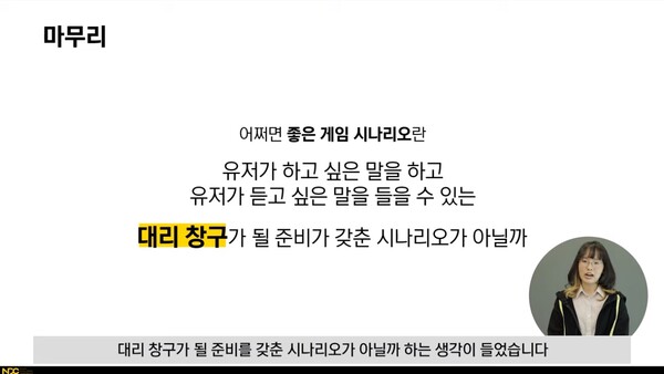 이 기획자는 “게임이 다른 매체와 구분되는 점은 유저의 목소리를 담을 수 있다는 것”이라며 “좋은 게임 시나리오란 유저가 하고 싶은 말을 하고 유저가 듣고 싶은 말을 들을 수 있는 대리 창구”라고 전했다.