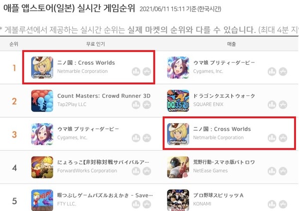 넷마블은 ‘제2의 나라’를 5개 지역(한국,일본,대만,홍콩,마카오) 구글플레이, 애플 앱스토어에 출시했다. 현재 이 게임은 애플 앱스토어 매출 기준 ▲한국 1위▲일본 3위▲대만 1위▲홍콩 2위▲ 마카오 8위로, 모든 출시 지역에서 TOP10에 진입했다.