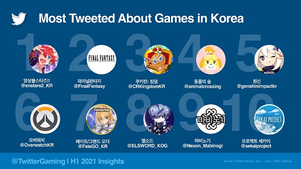 ‘2021 상반기 전 세계에서 가장 많이 언급된 게임’ 순위에서는 중국 미호요의 오픈월드 액션 RPG ‘원신’이 1위를 차지했으며, 에이펙스 레전드, 앙상블스타즈, 파이널 판타지, 동물의 숲, 나이브스 아웃, 포트 나이트, 몬스터 헌터, 페이트/그랜드 오더, 마인크래프트 등이 이름을 올렸다.