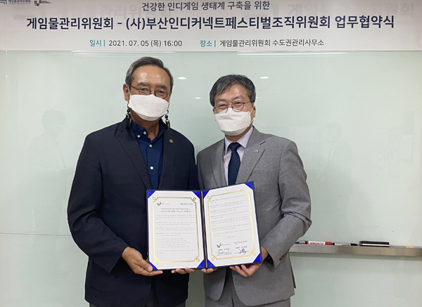 게임물관리위원회(위원장 이재홍)와 부산인디커넥트페스티벌조직위원회(위원장 서태건)는 지난 5일 게임위 수도권사무소 회의실에서 ‘건강한 인디게임 생태계 구축을 위한 업무협약’을 체결했다.