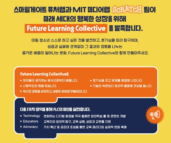 스마일게이트 희망스튜디오 퓨처랩(이사장 권혁빈, 이하 ‘퓨처랩’)은 미국 메사추세츠공과대학교(이하 ‘MIT’) 미디어랩 미첼 레스닉(Michel Resnick) 교수가 이끄는 연구그룹과 공동으로 창의학습 가치 확산을 위한 협의체 ‘퓨처 러닝 콜렉티브’(Future Learning Collective, 이하 ‘FLC’)를 발족한다고 18일 밝혔다.