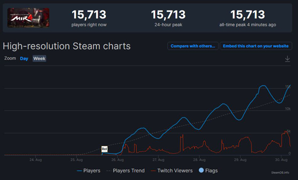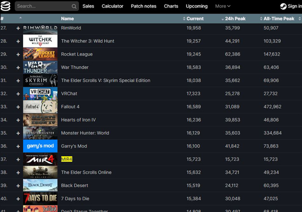 더불어 ‘미르4’의 스팀 순위는 37위를 기록 중이며, 일일 동시접속자 수는 1만5000명을 넘어섰다. 30일 오후 2시 기준 스팀 동시접속자 수는 현황 1만5713명으로 나타났다.