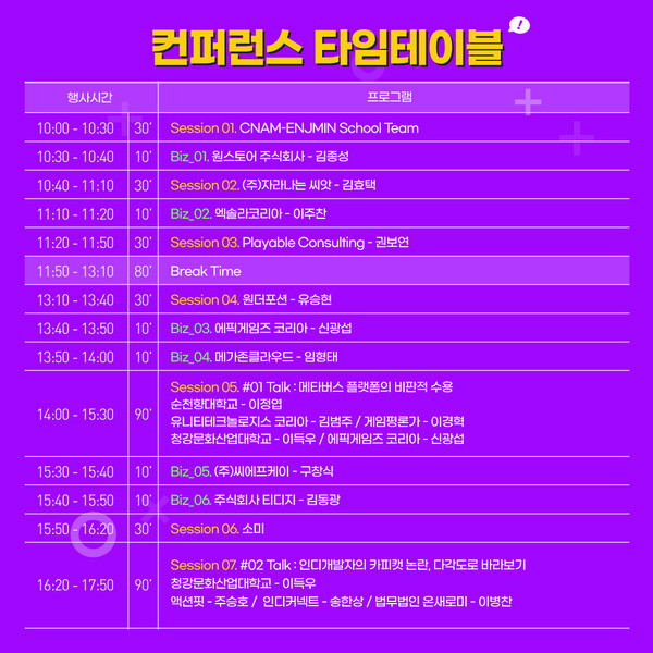이후 원스토어 주식회사의 김종성 매니저, ㈜자라나는씨앗의 김효택 대표, 엑솔라코리아의 이주찬 지사장, Playable Consulting 권보연 대표, 원더포션 유승현 대표, 에픽게임즈 코리아 신광섭 부장, 메가존클라우드 임형태 매니저, ㈜씨에프케이 구창식 대표이사, 주식회사 티디지 김동광 매니저, 소미(인디게임 개발자)가 강연을 맡는다.