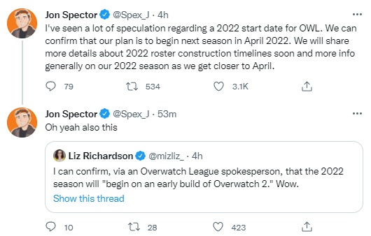 그러나 ‘오버워치 리그’측은 리그가 중단된다는 소문을 일축했다. 3일 존 스펙터(Jon Spector) ‘오버워치 리그’ 부사장은 “오버워치 리그와 관련해서 많은 추측이 나오고 있다”며 “다음 시즌은 2022년 4월에 시작될 예정”이라고 못박았다. 또한 ‘오버워치 리그’ 다음 시즌이 ‘오버워치2’로 진행된다는 소식에 대해서도 “맞다”고 답했다.