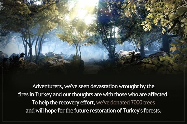 펄어비스(대표 정경인)가 ‘검은사막’, ‘검은사막 모바일’ 글로벌 이용자와 함께 대규모 산불 피해를 입은 터키에 묘목 7000 그루를 기부했다고 밝혔다.
