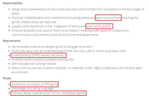 블리자드 엔터테인먼트는 최근 채용 공고를 통해 캘리포니아 어바인 본사에서 근무할 콘텐츠 개발자(Associate Content Designer)를 모집한다고 밝혔다. 플랫폼은 PC이며, 소속 팀은 미공개 프로젝트다. 또 직무 설명 및 채용 요건에 ‘오픈월드’, ‘RPG’, ‘FPS’, ‘멀티플레이’라는 단어가 언급됐다.