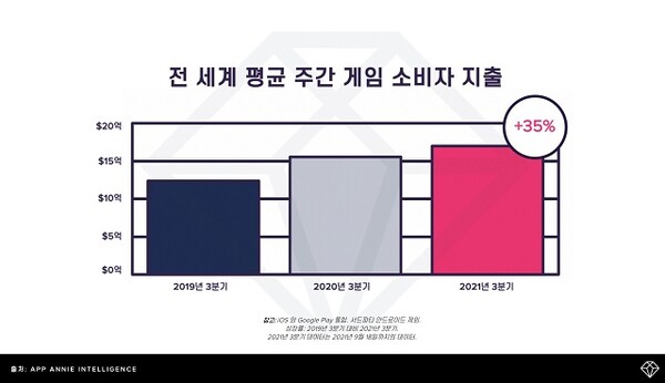 19일 앱애니에 따르면, 2021년 3분기 전 세계 소비자들은 역대 최고 분기 기록인 230억 달러(약 27조 원)를 지출한 것으로 나타났다. 이 중 한국 소비자들은 14.6억 달러(약 1.7조 원)를 지출하며 전 세계 지출의 약 6.5%를 차지했다. 이번 3분기 전 세계 평균 주간 게임 소비자 지출은 코로나19 이전인 2019년 3분기 대비 35% 증가한 것으로 분석됐다.